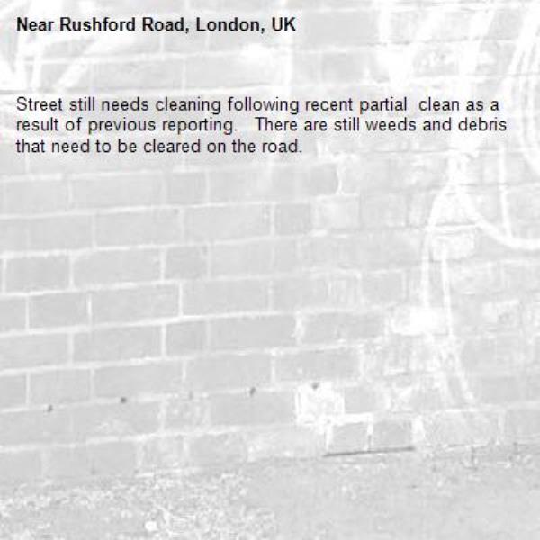 Street still needs cleaning following recent partial clean as a result of previous reporting. There are still weeds and debris that need to be cleared on the road.
